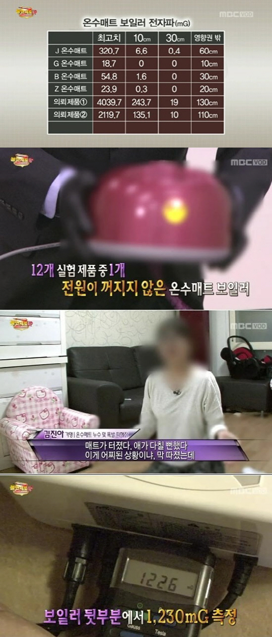 온수매트에서 전자파가 많이 발생되는 원인은 매트와 연결된 보일러 때문. 또한 실험제품 중 한 개가 전원이 꺼지지 않는 제품임이 확인돼 사용 중 누수 및 폭발 사고로 피해를 입은 피해자의 인터뷰도 공개돼 시청자들의 경각심을 일깨웠다.