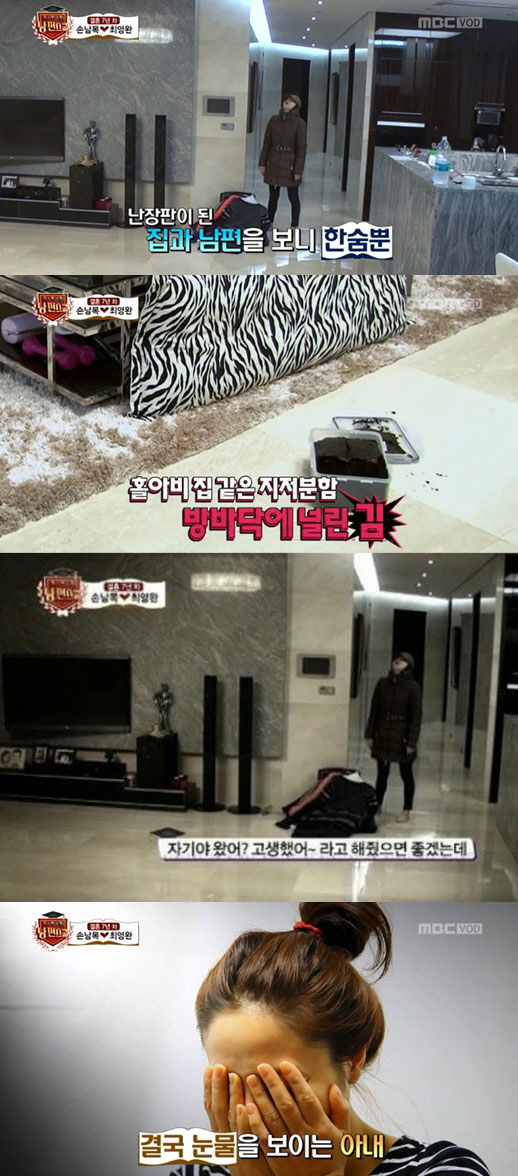 이날 방송에서 일주일 만에 지방 촬영을 마치고 집으로 온 최영남은 홀아비 집같은 난장판이 된 집과 소파에 누워 잠을 청하고 있는 남편을 보고 한숨을 내쉬었다.