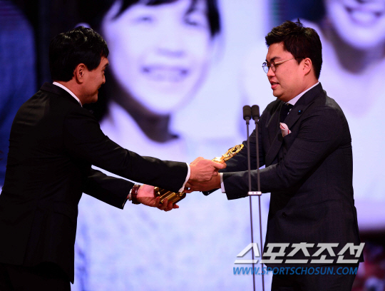 제34회 청룡영화상 시상식이 22일 서울 회기동 경희대학교 평화에 전당에서 열렸다. 최우수작품상을 수상한 소원의 필름모멘텀이 트로피를 받고 있다. 조병관 기자 rainmaker@sportschosun.com/2013.11.22/