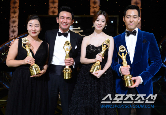제34회 청룡영화상 시상식이 22일 서울 회기동 경희대학교 평화에 전당에서 열렸다. 수상자들이 포즈를 취하고 있다. 왼쪽부터 여우조연상 라미란, 남우주연상 황정민, 여우주연상 한효주, 남우조연상 이정재. 정재근 기자 cjg@sportschosun.com/2013.11.22/