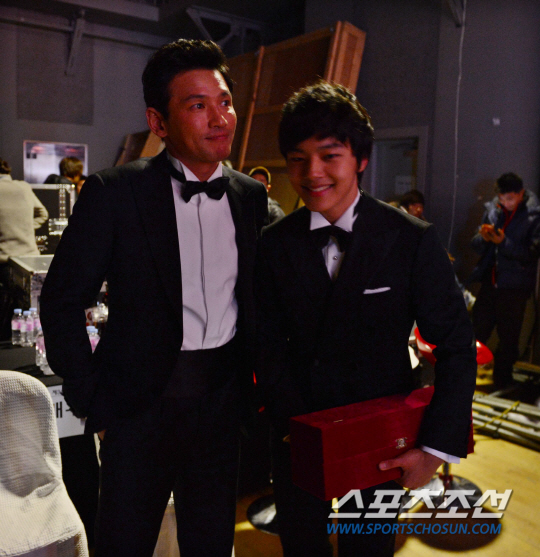 22일 오후 서울 경희대학교 평화의 전당에서 '제 34회 청룡영화상' 시상식이 열렸다. 시상식 무대 뒤에서 남우주연상을 받은 황정민과 신인상을 받은 여진구가 인사를 나누고 있다. 김경민 기자 kyungmin@sportschosun.com / 2013.11.22.