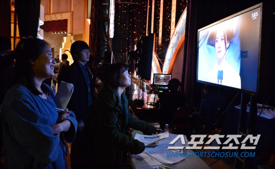 22일 오후 서울 경희대학교 평화의 전당에서 '제 34회 청룡영화상' 시상식이 열렸다. 무대 뒤에서 방송 관계자들이 모니터로 시상식을 지켜보고 있다. 김경민 기자 kyungmin@sportschosun.com / 2013.11.22.