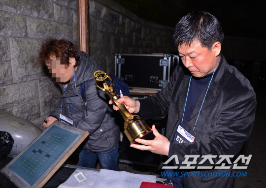 22일 오후 서울 경희대학교 평화의 전당에서 '제 34회 청룡영화상' 시상식이 열렸다. 시상식 무대 뒤에서 트로피에 수상자들의 이름을 새기는 작업을 하고 있다. 김경민 기자 kyungmin@sportschosun.com / 2013.11.22.