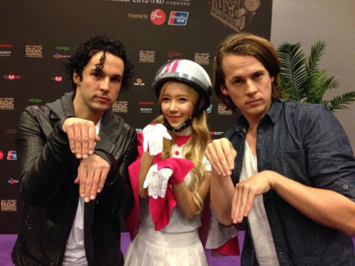 공개된 사진에는 일비스의 두 멤버 베가르드 일비소케르와 바트 일비소케르 그리고 크레용팝의 엘린이 인증샷 촬영을 위채 포즈를 취하고 있는 모습이 담겨있다.