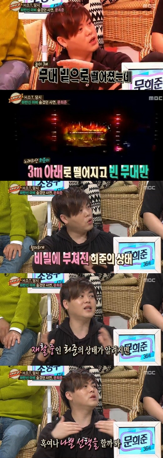 이날 방송에서 문희준은 "4집 '아이야' 컴백 콘서트를 하던 중 추락 사고를 당했다"며 "콘서트 날 비가 너무 많이 와서 미끄러져 무대 밖으로 떨어졌다. 창피하다는 생각에 뛰어 올라가서 눕는 안무로 마무리했는데 다리가 안 움직였다"고 입을 열었다.