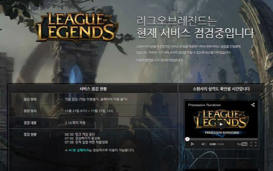 인기 온라인 게임 리그오브레전드(LOL)가 점검에 들어갔다.