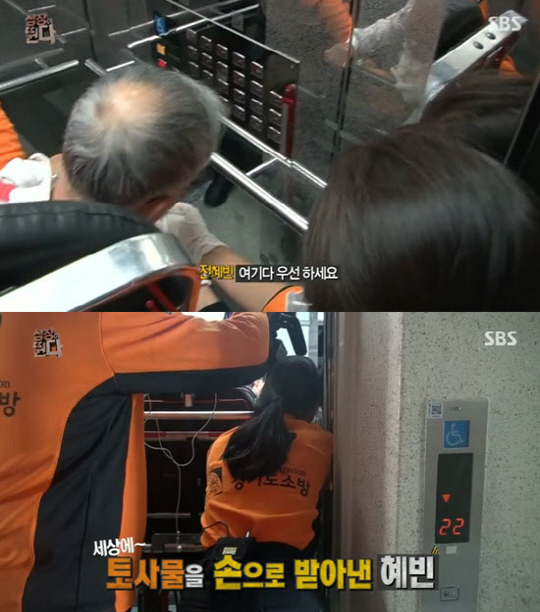 결국 할아버지는 구토 증세를 참지 못하고 엘리베이터에 구토를 했고, 이에 전혜빈은 자신의 양 손을 내밀며 "여기다 우선 하세요"라며 토사물을 받아 내 시선을 집중시켰다.