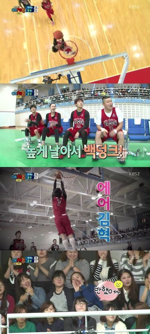 특히 이날 방송에서는 김혁이 놀라운 묘기를 선보여 눈길을 끌었다. 속공찬스를 잡은 김혁은 그대로 달려가 높게 날아서 반 회전하는 백덩크 슛을 선보여 모두를 놀라게 했다.