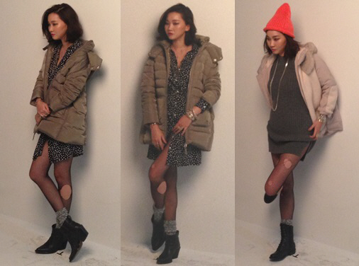이번 화보에서 장윤주는 겨울 시즌을 맞아 패딩점퍼에 셔츠 원피스와 니트만을 매치한 채 아찔한 하의실종 패션을 보여주고 있다.