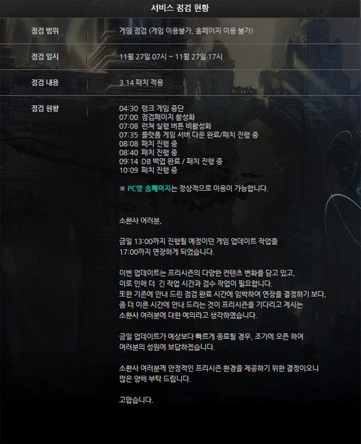 라이엇게임즈는 27일 오전 7시부터 오후 1시까지 네트워크 점검 및 게임 업데이트를 위해 7시간 동안 롤점검에 돌입한다고 공지했으나 오후 5시까지로 연장됐다.