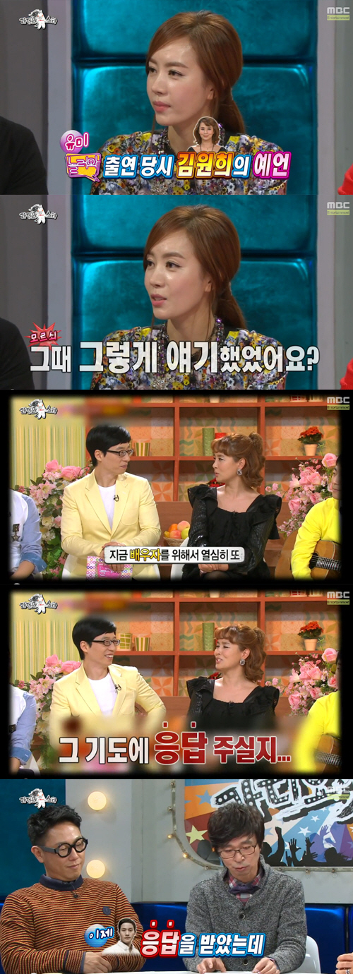 이날 MC들은 최근 화제가 된 김유미와 정우의 열애를 언급하며 "김유미가 '놀러와' 출연 당시 김원희가 '5년째 배우자 기도를 하면서 응답 주실 분을 찾고 있다'라고 말한 적이 있다. 분명히 '응답' 주실 분을 찾고 있다고 말했다"며 운을 뗐다.