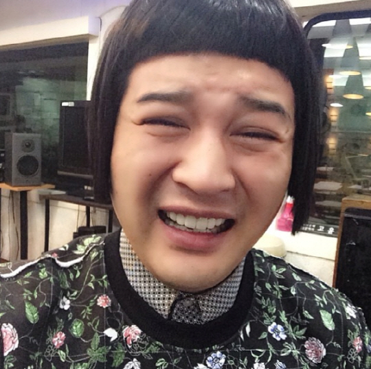 사진에서 신동은 추성훈의 딸 추사랑의 헤어스타일을 따라 한 듯한 가발을 착용하고 한껏 울상을 짓고 있는 모습이다.
