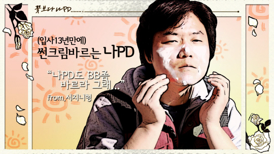 사진에는 '입사 13년 만에 선크림 바르는 나PD'라는 문구와 함께 나영석 PD가 얼굴이 하얗게 되도록 선크림을 열심히 바르고 있는 모습이 담겨 있다.