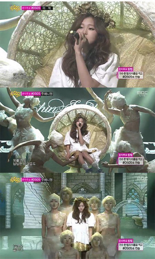 그녀는 흰 블라우스에 황금빛 치마를 입고 머리에 화관을 얹어 여신 같은 자태를 뽐냈다. 또 그녀는 청아한 목소리로 가창력을 뽐내며 음악팬들의 눈길을 끌었다.