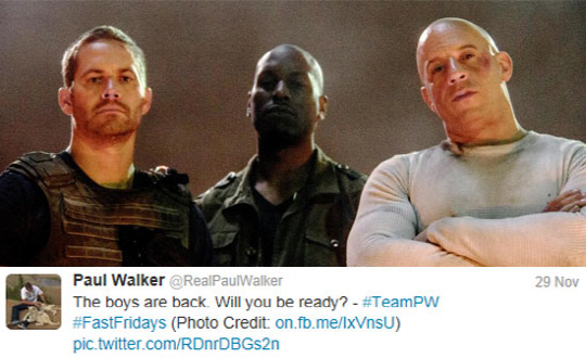 폴 워커는 지난 11월 29일 자신의 트위터를 통해 컴백 소식을 알린 것이 마지막 메시지가 되어 안타까움을 더하고 있다. 그는 "곧 우리들 컴백해. 너희들 준비됐어?(The boys are back. Will you be ready?)"라는 글과 함께 영화 '분노의 질주' 시리에 함께 출연하는 배우 타이레스깁슨, 빈 디젤과 함께 찍은 사진을 게재했다.