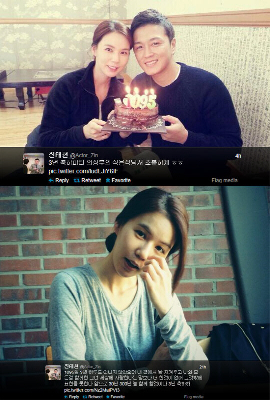 1일 진태현은 자신의 트위터에 "3년 축하파티. 의정부의 작은 식당서 조촐하게"라는 글과 함께 사진 한 장을 게재했다.