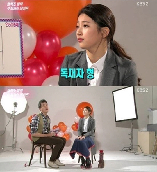 이날 수지는 인터뷰에서 연애 스타일을 알아보는 심리테스트를 통해 자신의 연애 스타일이 밝혀졌다. 심리테스트 결과 '독재자형'으로 나타나자, 수지는 "다시 한 번 해보자"며 당황해 했다.