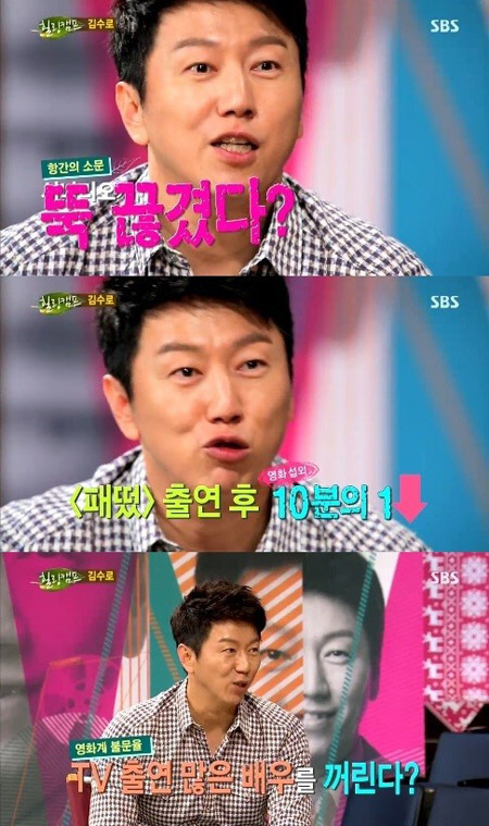 이날 김수로는 "최근 영화 시나리오가 툭 끊겼다는 게 사실이냐"는 질문에 "사실 SBS '패밀리가 떴다' 출연 후 시나리오가 10분의 1로 뚝 떨어진 건 맞다. 영화계는 희소성이 높은 배우를 선호한다. 방송에 얼굴을 많이 보인다는 건 희소성이 떨어진다는 뜻이다"고 설명했다.