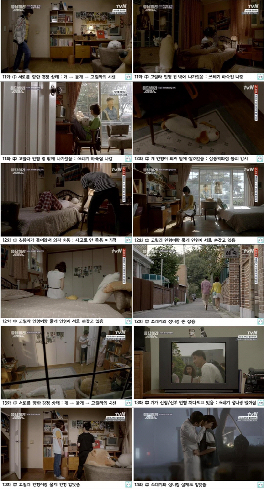 글쓴이에 따르면 '응답하라 1994'에 등장하는 개는 칠봉(유연석 분), 물개는 성나정(고아라 분), 고릴라는 쓰레기(정우 분)를 의미한다. 드라마 속 개, 물개, 고릴라 인형들이 삼각관계에 빠져있는 성나정 쓰레기 칠봉 세 사람 관계는 물론, 앞으로 닥칠 상황 등을 암시한다는 것.