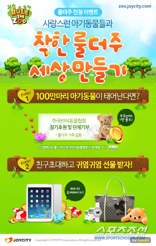 조이시티는 '룰더주 for Kakao'의 정식 출시를 기념해 오는 16일까지 카카오톡 친구를 1명 이상 초대한 유저를 대상으로 추첨을 통해 아이패드에어와 100젬(게임캐시), 10만 골드(게임머니)로 구성된 '슈퍼패키지'를 선물로 증정한다. 10명 이상 초대한 유저에게는 추첨을 통해 고급 핸드백과 아가타 시계, 동물 쿠션 등을 선물로 제공한다. 또 16일까지 100만 마리의 아기 동물 입양을 달성할 경우, 유저 전원에게 1만 골드(게임머니)를 증정하고, 동물 보호단체 한국반려동물협회에 소정의 기부금을 전달할 예정이다.