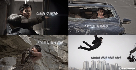 이번에 공개된 영상은 실전형 주체격술, 스피디한 카체이싱, 익스트림 암벽등반, 18m 한강 낙하 액션 등을 소화해낸 공유의 모습과 액션 제작 과정이 고스란히 담겨 눈길을 끈다.