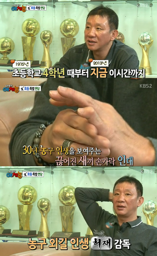 이날 전주 KCC 선수들과 '예체능' 멤버들과의 연습경기 후 허재 감독은 강호동과의 특별 면담을 진행했다.