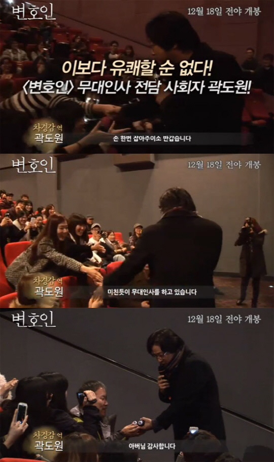 이에 부산 무대인사에서 곽도원은 "손 한번 잡아주이소"라며 객석의 관객들과 손을 맞대며 인사했다. 이어진 대구 무대인사에서는 "제주에서부터 서울을 향해 미친 듯이 무대 인사를 하고 있습니다"라고 호소력 짙은 목소리로 관객들 한명 한명과 인사를 나누고 있다.