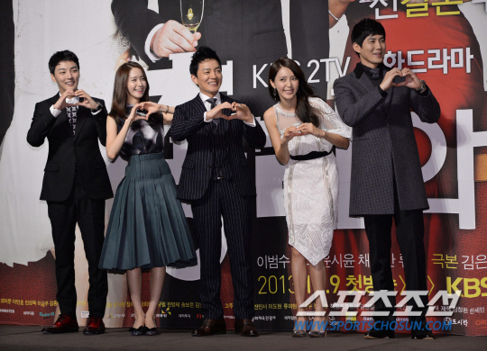 4일 오후 서울 그랜드엠버서더호텔에서 KBS 드라마 '총리와 나' 제작발표회가 열렸다. 드라마 '총리와 나'는 고집불통 대쪽 총리와 그와 결혼하고 싶어 안달 난 20대 꽃처녀의 코믹 반전 로맨스를 담는다. 제작발표회에서 배우 윤시윤(왼쪽부터), 윤아, 이범수, 채정안, 류진이 포즈를 취하고 있다. 김경민 기자 kyungmin@sportschosun.com / 2013.12.04.