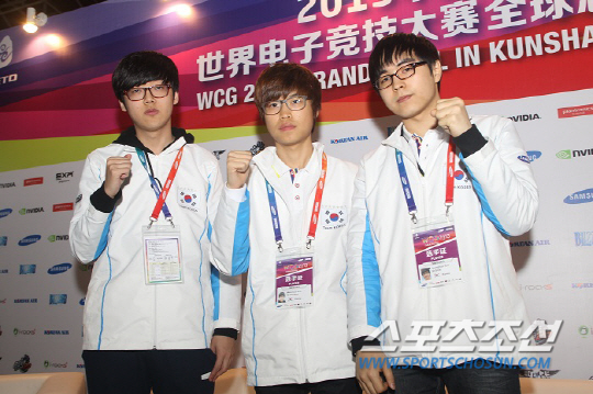 ◇지난 1일 중국 쿤산에서 폐막한 WCG 2013 그랜드 파이널에서 한국이 종합우승을 차지했다. 한국이 2년만에 중국을 꺾고 우승을 차지하는데 견인차 역할은 '스타크래프트2' 종목에 참가한 3명의 선수들이 해냈다. '스타2'에서 금메달을 차지한 김민철(가운데), 은메달을 딴 김정훈(오른쪽), 동메달을 추가한 원이삭이 한 자리에 모여 파이팅을 외치고 있다. 사진제공=WCG
