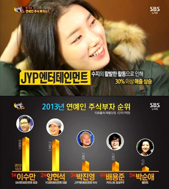 특히 JYP엔터테인먼트 대표 박진영은 수지로 인해 매출이 30%이상 상승하며 3위를 기록, 시청자들의 눈길을 끌었다.