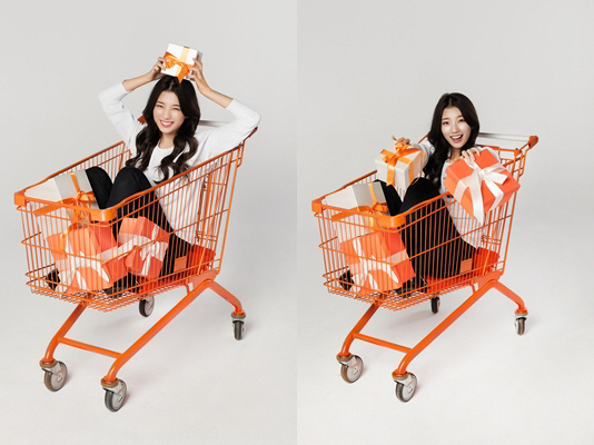 공개된 사진 속 수지는 오렌지색 쇼핑카트 안에 쏙 들어가 어린 아이처럼 즐거워하는 모습. 또 다른 사진에는 흰색 투피스를 얌전히 입은 수지가 오렌지빛 루돌프 머리띠를 하고 선물 상자를 내미는 모습을 선보이고 있다.