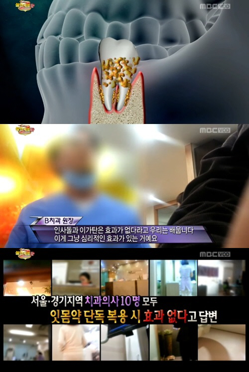 이에 제작진은 잇몸약에 대해 서울 경기 지역 치과 10곳을 확인 해본 결과 잇몸약 단독 복용 시 효과 없다는 답변을 들었다.
