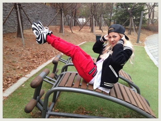 공개한 사진에는 공원 운동 기구 위에서 윗몸일으키기 동작을 하고 있는 산다라박 모습이 담겨 있다. 특히 찌푸린 인상으로 힘들어 하는 척 하는 산다라박의 귀여운 표정이 눈길을 끈다.