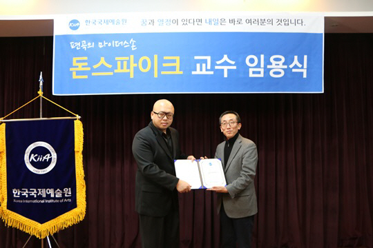 전임 교수로 임용된 돈스파이크는 지난 4일 서울 압구정로데오에 위치한 한국국제예술원에서 실용음악과 전임교수 임용식을 치렀다.