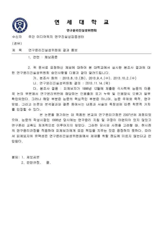 연세대 연구윤리진실성위원회가 미디어워치 연구진실성검증센터에 보낸 공문에는 "1998년 12월 제출한 석사학위 논문의 이론적 논의 부분에서 연구윤리위반에 해당하는 인용 출처 표기 누락 및 인용방식의 오류가 일부 확인됐다"면서도 "그러나 해당 부분은 논문의 핵심적인 부분은 아니며 논문 주제와 목적, 연구 방법, 분석결과와 결론 등에서는 내용과 서술의 독창성에 따른 학문적 가치를 인정할 수 있다"고 설명했다.