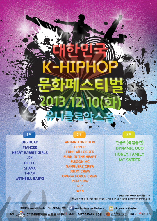 사단법인 한국힙합문화협회에서 주최하고 문화체육관광부가 후원하는 이번 공연은 인터파크(ticket.interpark.com)를 통해 예매 가능하다.