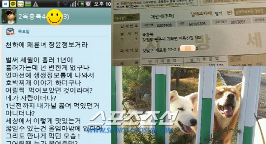 가수 장윤정의 모친 육흥복 씨가 올린 것으로 추정되는 욕설 편지가 공개돼 충격을 주고 있는 가운데, 해당 글에 재산세 사진과 개 사진을 함께 올려 네티즌들의 궁금증을 자아내고 있다.
