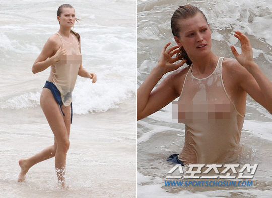 이날 토니 가른은 비키니 상의 대신 속이 훤히 비치는 민소매 티셔츠를 입고 바닷 속에 들어갔다. 토니 가른은 물에 젖은 머리칼을 길게 늘어뜨리며 풍만한 가슴라인을 그대로 노출해 시선을 모았다.