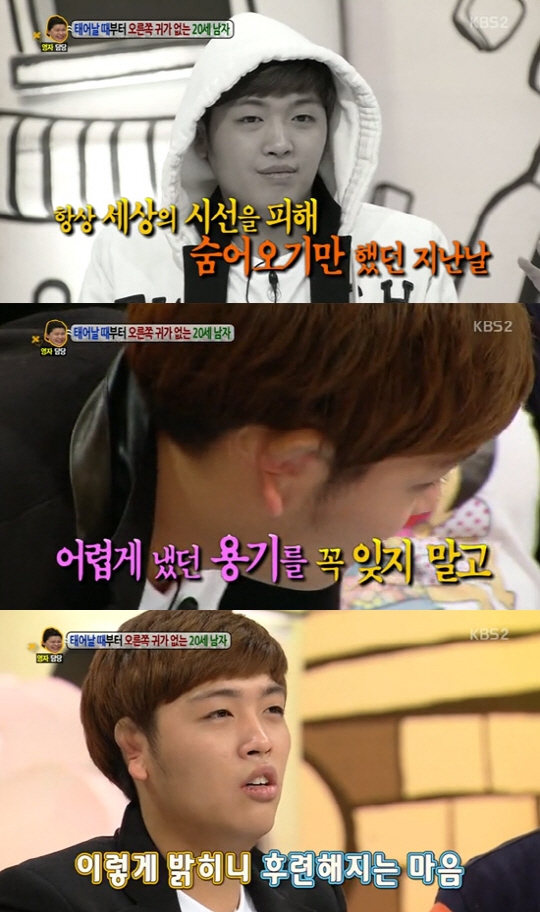 이날 사연의 주인공인 '귀 없는 남자'는 "선천적으로 귀가 없이 태어났다"며 "평소에는 귀를 머리카락이나 모자로 가리고 다닌다. 물렁뼈로 귀 모양처럼 잡아놓은 상태지만 귓구멍 흔적이 없어 한 쪽 귀만 들린다"며 자신의 귀의 상태에 대해 전했다.
