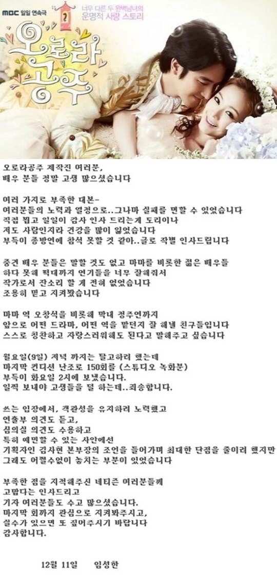 "제작진 여러분, 배우 분들 정말 고생 많으셨습니다"로 시작하는 임성한의 글에는 "여러 가지로 부족한 대본, 여러분들의 노력과 열정으로 그나마 실패를 면할 수 있었다"라고 운을 뗐다.