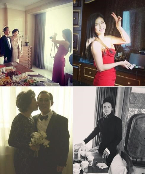 또한 남동생 전태수도 검정 슈트로 멋을 낸 모습이며, 특히 이번에 공개된 하지원의 부모님의 볼키스 사진은 다정하면서도 따뜻한 분위기를 자아낸다.