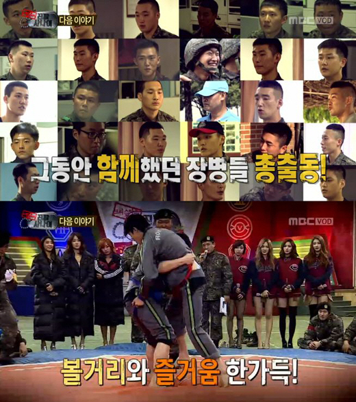 특히 장병들이 씨름을 하고 있는 모습 중 미쓰에이와 씨스타 멤버들이 이들을 응원는 모습이 포착돼 많은 이들의 시선을 끌었다.