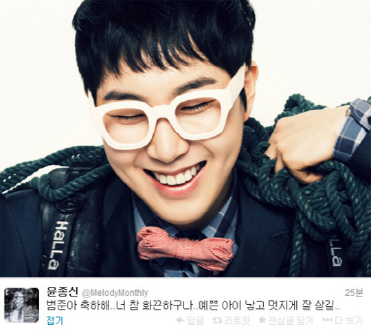 16일 윤종신은 자신의 트위터에 "범준아 축하해. 너 참 화끈하구나. 예쁜 아이 낳고 멋지게 잘 살길"이라는 글을 게재하며 장범준의 앞날에 축복을 빌었다.