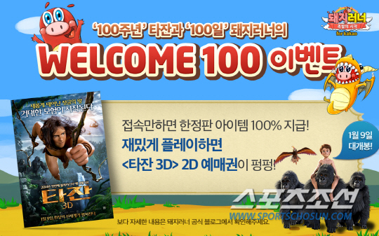 아프리카TV는 탄생 100주년을 맞아 100% 모션캡쳐 3D 애니메이션으로 새롭게 탄생한 '타잔'을 아기자기한 돼지 캐릭터와 접목해 게임 내 선보이는 것은 물론, 오는 22일까지 게임에 접속한 이용자 전원에게 선물로 제공한다. 또 3레벨 이상을 달성하거나 카카오톡 친구 초대 등 특정 미션을 수행한 이용자에게는 추첨을 통해 총 500장의 '타잔 3D' 예매권을 선물한다.