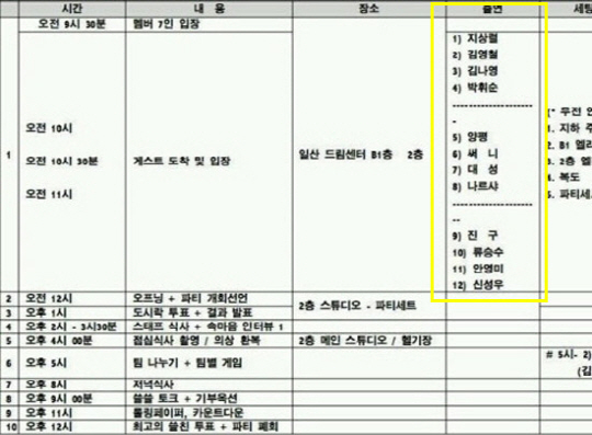 해당 게시물에는 '무한도전-쓸친소'의 큐시트가 담겨 있다. 특히 출연자 명단에 지상렬, 김영철, 김나영, 박휘순, 양평이형, 써니, 대성, 나르샤, 진구, 류승수, 안영미, 신성우의 이름이 적혀 있어 네티즌들의 이목이 집중되고 있는 상황.