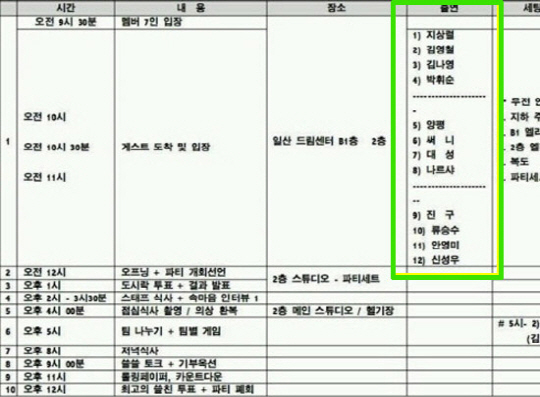 해당 게시물에는 '무한도전-쓸친소'의 큐시트가 담겨 있다. 특히 쓸친소 게스트 명단에 지상렬, 김영철, 김나영, 박휘순, 양평이형, 써니, 대성, 나르샤, 진구, 류승수, 안영미, 신성우의 이름이 적혀 있고 '쓸친소' 파티의 세부적인 진행내용이 자세히 게재되어 있다.