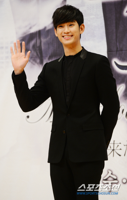 | SBS 수목드라마 '별에서 온 그대' 제작발표회가 16일 서울 목동 SBS 사옥에서 열렸다. 주연배우 김수현이 무대에 올라 포즈를 취하고 있다./2013.12.16/ |
