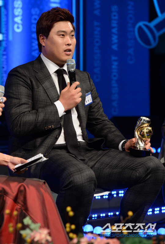2013 카스포인트 어워즈가 9일 서울 신라호텔에서 열렸다. 카스포인트 어워즈 특별상을 수상한 류현진이 질문에 답하고 있다. 카스포인트 어워즈는 경기 결과에 따라 선수들에게 포인트를 부여하여 누적 점수에 따라 순위를 결정하는 카스포인트 부문과 경기 중 기록으로 평가할 수 없는 결정적인 순간, 감동적인 순간을 시상하는 카스모멘트 부분으로 나누어 시상한다. 허상욱 기자 wook@sportschosun.com