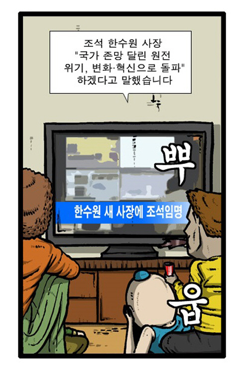 그런데 그날 주인공과 어머니가 함께 보던 뉴스에 '한수원 새 사장에 조석 임명'이란 뉴스가 뜨게 돼 주인공이 난처한 상황에 처하게 된 모습이 그려졌다.