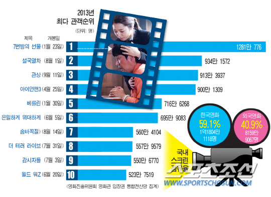 올해 한국의 영화관객이 처음 2억명을 돌파할 것으로 예상되고 있다. 지난 해 1억 9489만 587명(이하 영화진흥위원회 영화관 입장권 통합 전산망 집계)의 관객을 모았던 스크린이 올해는 지난 16일까지 1억 9964만 175명을 모아 연말까지 2억명의 관객을 넘길 것이 확실시 된다. 한국영화가 총 1억1804만1118명을 모아 59.1%의 점유율을 보였고 외화가 8159만 9067명을 모았다.
